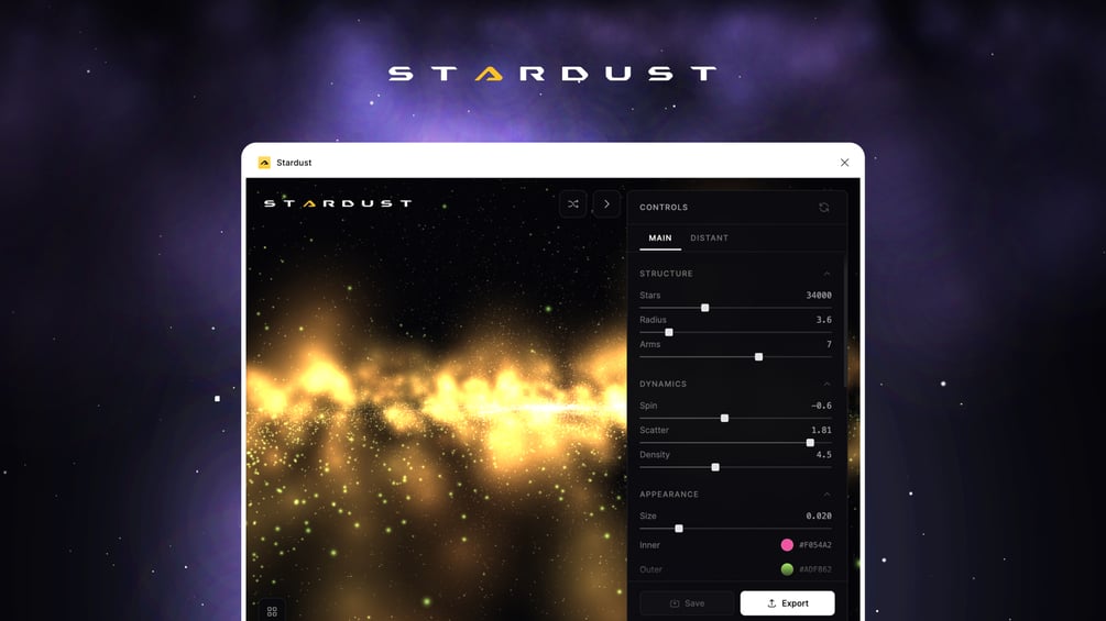 Stardust is a professional-grade galaxy generator built for designers who need beautiful, customizable space visuals. Perfect for hero sections, landing pages, presentations, and creative projects.